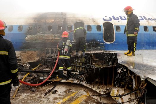 Presa iraniană a relatat că trenul posterior al avionului de tip Tupolev 154 al companiei Taban a luat foc la aterizare.