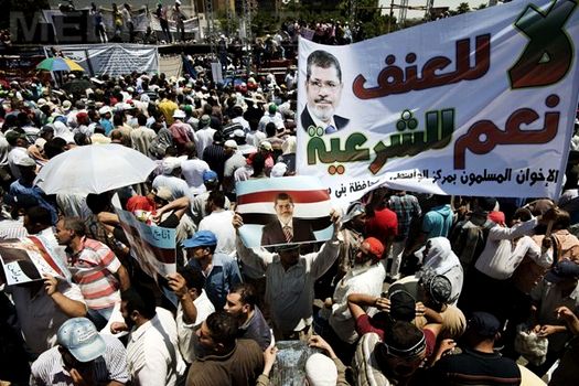 Susţinătorii lui Morsi – Fraţii Musulmani şi alte formaţiuni islamiste, inclusiv o parte a fundamentaliştilor islamişti – evidenţiază caracterul democratic al alegerii preşedintelui pentru a califica drept „contrarevoluţie” îndemnurile privind demisia sa.