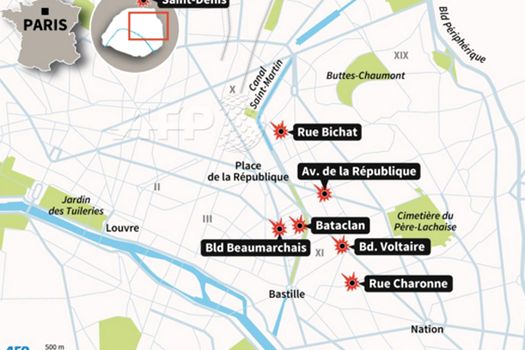 Agenţia France Press a publicat pe contul său de Twitter o hartă a locaţiilor în care au avut loc atentatele teroriste.