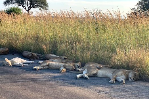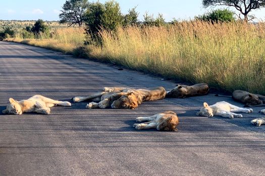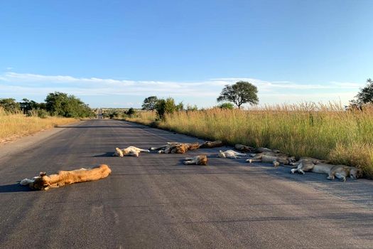Kruger visitors that tourists do not normally see. #SALockdown This lion pride are usually resident on Kempiana Contractual Park, an area Kruger tourists do not see. This afternoon they were lying on the tar road just outside of Orpen Rest Camp.