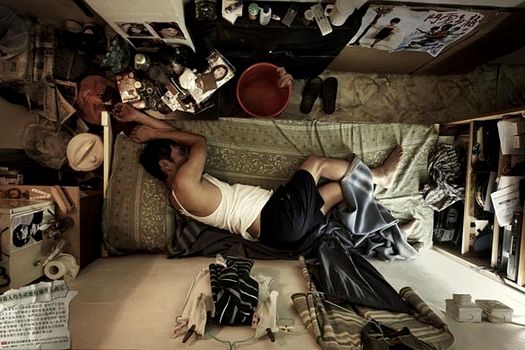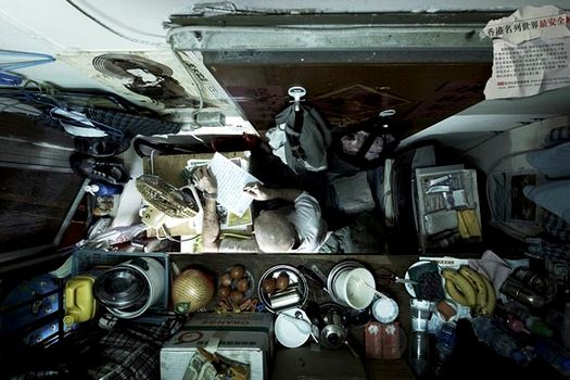 În una dintre fotografii, o familie de patru persoane trebuie să împartă un pat dublu care abia le mai lasă spaţiu de mişcare. Asemenea celor mai multre dintre imagini, pereţii sunt acoperiţi de la podea la tavan cu rafturi umplute cu mâncare, haine, produse cosmetice şi alte lucruri de folosinţă zilnică.