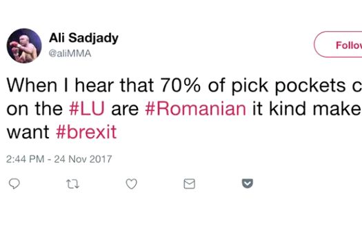 „Când aud că 70% din hoţii de buzunare prinşi la metroul din Londra sunt români mă cam face să vreau Brexit”, afirma Sadjady, într-un mesaj pe Twitter postat în noiembrie 2017.