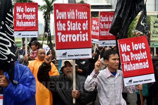 Răspunzând unui apel lansat de gruparea islamistă radicală Hizbut Tahrir, manifestanţii – bărbaţi, femei şi copii – au strigat „Franţa este o ţară teroristă”, a constatat un jurnalist AFP.