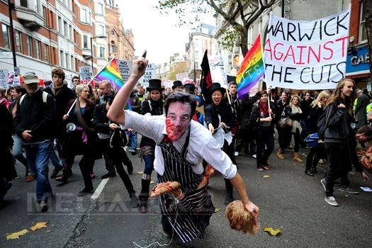 Studenţii protestează faţă de creşterea, începând din 2012, a taxelor de înscriere la universitate. În prezent, aceste taxe sunt în valoare de 3.300 de lire sterline (aproape 4.000 de euro).