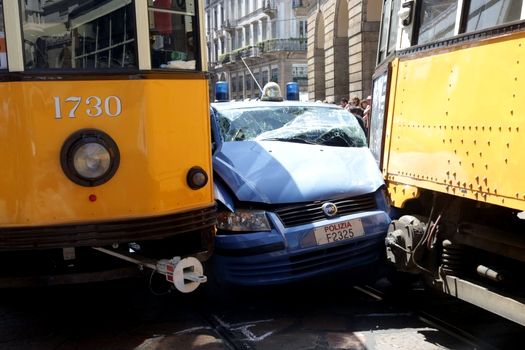 Un vehicul al poliţiei italiene a încercat să depăşească un tramvai. Şoferul nu a fost foarte atent la vehiculele care veneau din sens opus, astfel că maşina de poliţie a fost prinsă între cele două tramvaie.
