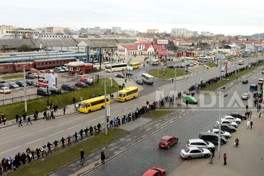 Arborând drapeluri ucrainene şi europene şi scandând „Ucraina este Europa”, manifestanţii au format un lanţ uman plecând de la Piaţa Independenţei, din centrul Kievului, spre direcţia vest.