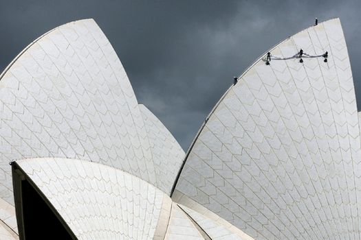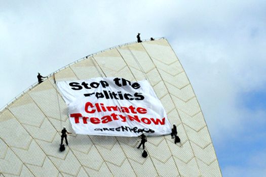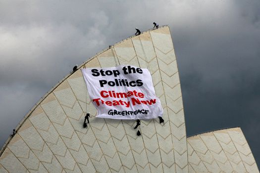 Cinci militanţi ecologişti au fost arestaţi după ce s-au căţărat pe clădirea albă, în formă de cochilie, pentru a amplasa o banderolă pe care se putea citi „Încetaţi cu politica – un acord pentru climă, acum”.