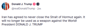 „Iranul a fost de acord să nu mai închidă niciodată Strâmtoarea Ormuz. Nu va mai fi folosită ca armă împotriva lumii!”, a mai scris președintele SUA.
