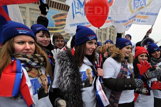 Această manifestaţie, cu zece zile înainte de prezidenţiale, este considerată un răspuns la vastele mitinguri ale opoziţiei care se desfăşoară în mod regulat la Moscova începând din decembrie, de la alegerile legislative controversate câştigate de partidul aflat la putere, Rusia Unită.