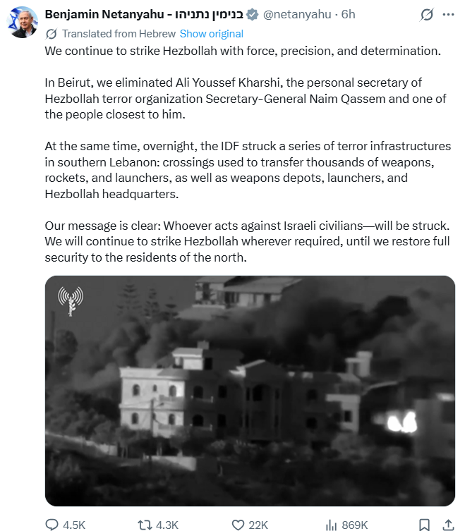 „Continuăm să lovim Hezbollah cu forță, precizie și determinare”, a scris Netanyahu, într-un mesaj publicat pe X.
