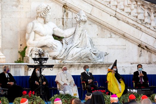 Papa Francisc, în vârstă de 83 de ani, a participat la slujbă alături de alţi lideri creştini, musulmani şi budişti. Împreună, au ţinut un moment de reculegere pentru victimele pandemiei, dar şi pentru cei afectaţi de războaiele din Siria şi Nagorno-Karabah.