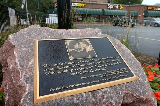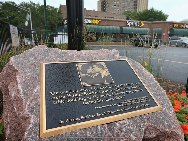 Miercuri, o plăcuţă considerată istorică a fost montată la colţul străzii Dorchester Avenue cu 53rd Street din Chicago, pentru a marca locul exact în care cei doi s-au sărutat pentru prima dată.