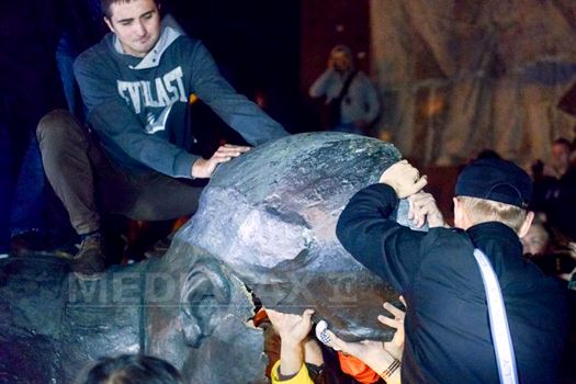 O statuie a lui Lenin din Harkov, demontată în timpul unui miting al naţionaliştilor ucraineni – FOTO