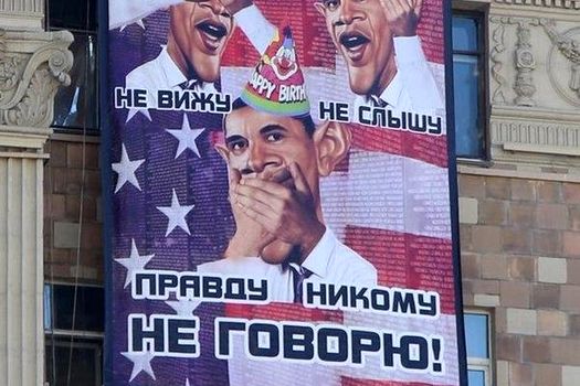 Preşedintele american, Barack Obama, a primit o urare neobişnuită, luni, la aniversarea a 53 de ani din partea unor persoane care au amplasat pe faţada unei clădiri din Moscova un banner în care liderul de la Casa Albă este comparat cu cele "Trei maimuţe înţelepte".