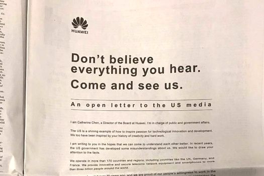 Huawei Technologies a lansat un anunţ publicitar în paginile principalelor ziare din SUA, îndemnând cititorii să nu creadă "tot ceea ce aud" despre firma de tehnologie chineză, ca metodă de apărare împotriva acuzaţiilor guvernamentale ale SUA că echipamentele sale pot fi utilizate pentru a spiona.