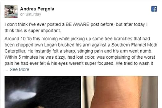 Andrea Pergola a relatat că în timp ce stăteau pe aleea din faţa casei, l-a auzit pe fiul ei, Logan, scoţând un strigăt de durere. Când s-a uitat la braţul fiului ei a văzut formându-se o umflătură uriaşă şi un model ciudat, care semăna cu un semn de arsură.