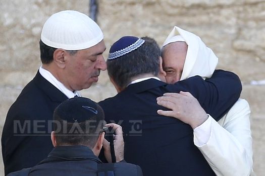Papa l-a îmbrăţişat apoi fratern pe rabinul Abraham Skorka şi pe profesorul musulman Omar Abboud, amândoi prieteni argentinieni apropiaţi din Buenos Aires, care l-au însoţit în vizita în Ţara Sfântă.