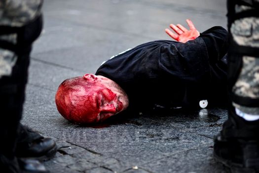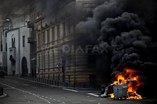 În poliţişti s-a aruncat cu pietre, cocteiluri Molotov şi alte proiectile, după care protestatarii au fost luaţi cu asalt, în mai multe rânduri, fiind obligaţi să fugă.