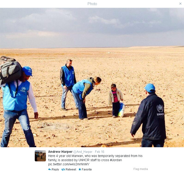 Andrew Harper, reprezentantul de ţară al Înaltului Comisariat pentru Refugiaţi al Naţiunilor Unite pentru Iordania, a publicat, luni, pe Twitter, fotografia unui băieţel de patru ani care strabătea deşertul, dinspre Siria spre Iordania.