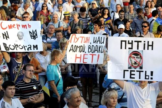 Manifestanţii fluturau pancarte pe care scria: „Opriţi-l pe nebun! Putin e un asasin” sau „Afară din Ucraina! Rusia este un terorist. Moarte ocupanţilor ruşi!”.