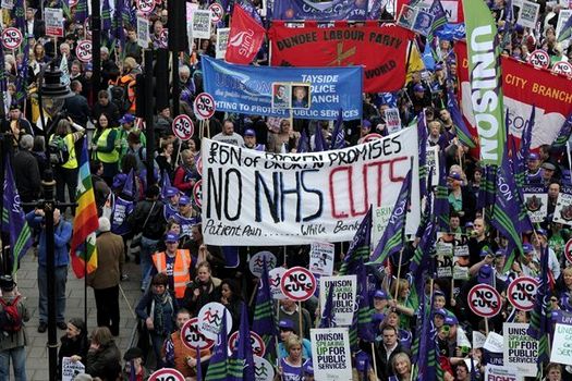 „Nu distrugeţi Marea Britanie!”, „Să ne apărăm serviciile publice!”, proclamau pancartele manifestanţilor. Mulţi au venit în familie, cu cărucioare de copii şi vuvuzele.