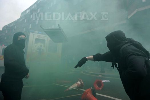 În pofida unui important dispozitiv de securitate, confruntări cu poliţia au izbucnit în timpul manifestaţiei pe strada Oxford, una dintre marile artere comericale din Londra.