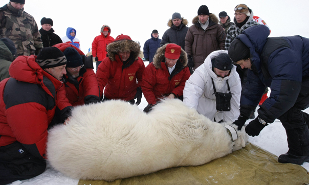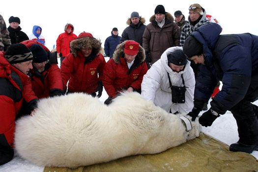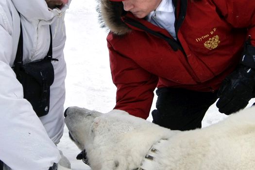 Imaginile difuzate de posturile de televiziune surprind momentul în care premierul Rusiei mângâie un urs polar uriaş. Îmbrăcat într-o vestă de culoare roşie, premierul i-a ajutat pe oamenii de ştiinţă să preleveze mostre de la ursul adormit, să îl cântărească şi să îi instaleze un emiţător.