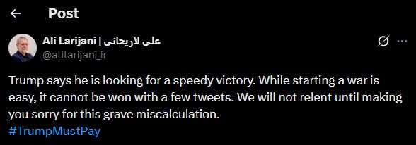 „Trump spune că urmărește o victorie rapidă. Deși este ușor să începi un război, acesta nu poate fi câștigat cu câteva tweet-uri. Nu vom ceda până nu vă vom face să vă pară rău pentru această gravă greșeală de calcul”.