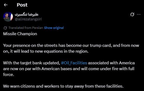 „Instalațiile petroliere asociate cu America sunt acum la egalitate cu bazele americane și vor fi atacate cu toată forța. Îi avertizăm pe cetățeni și pe lucrători să stea departe de aceste instalații”, a declarat Alireza Tangsiri, într-o postare publicată pe X.