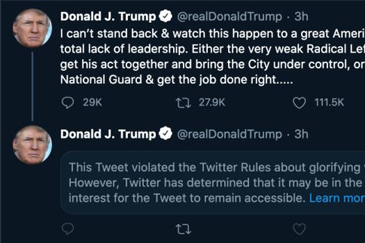 În acestă din urmă ciocnire, Trump a scris pe Twitter cu privire la demonstraţiile violente din Minneapolis, de după uciderea cetăţeanului de culoare, George Floyd, de către un poliţist alb. Trump a scris că “golanii dezonorează memoria lui George Floyd” şi a ameninţat voalat că va trimite armata.