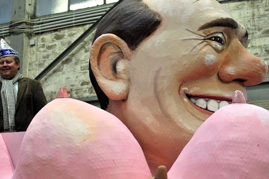 Un cap gigant al lui Silvio Berlusconi afişând un larg surâs, mergând stânjenit pe o mare de sâni, în semn de aluzie la escapadele extraconjugale ale preşedintelui Consiliului Italian, este vedetă, alături de Barack Obama, prezent pe mai multe care.