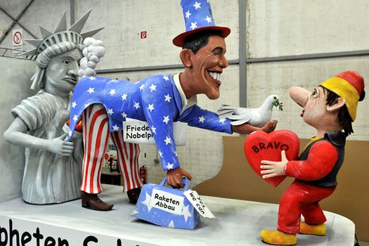 Una dintre ele îl înfăţişează pe preşedintele american ca Unchiul Sam primind Premiul Nobel pentru Pace, în timp ce Statuia Libertăţii îi arde fesele cu torţa.