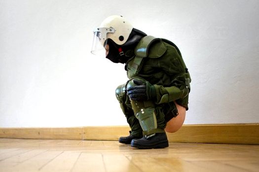 „Petra” este făcută din metal şi silcon, poartă o uniformă în culorile poliţiei germane, o cască albă şi stă pe vine, cu fesele la vedere şi pantalonii parţial căzuţi. Sub ea, o baltă de gelatină.