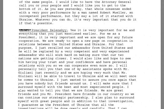 Donald Trump a insistat: „Vor trebui verificate anumite lucruri. Îi voi spune domnului Giuliani să vă sune, îi voi cere şi procurorului general Barr să vă sune şi vom verifica totul. Sunt sigur că veţi rezolva. Am auzit că procurorul a fost tratat foarte rău şi că a fost un procuror foarte corect, deci succes în toate. Economia dumneavoastră se va îmbunătăţi din ce în ce mai mult, pot anticipa. Aveţi multe resurse. Este o ţară măreaţă. Am mulţi prieteni ucraineni, sunt oameni incredibili”.