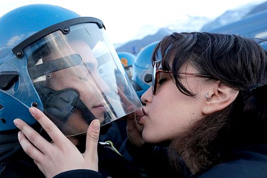 Studenta în vârstă de 20 de ani, Nina de Chiffre, a fost fotografiată în timp ce săruta casca agentului de poliţie Salvatore Piccione, în cursul unui protest faţă de construirea liniei feroviare Torino-Lyon.