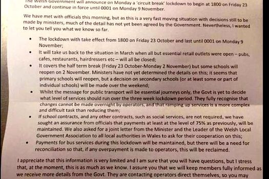 În scrisoarea din 16 octombrie, John Pockett scrie: „Guvernul galez va anunţa luni măsuri de carantină care vor începe vineri, 23 octombrie la ora 18:00 şi va continua până la 00:01, luni 9 noiembrie.