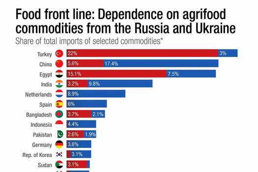 De exemplu, ponderea importurilor din Federaţia Rusă şi Ucraina – ca procent din totalul importurilor de grâu, porumb, orz, colza, ulei de floarea soarelui şi seminţe – este de 25,9% pentru Turcia, 23% pentru China şi 13% pentru India.