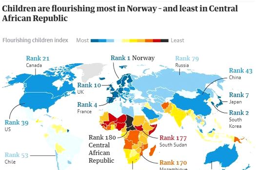 Norvegia, Coreea de Sud, Olanda, Franţa şi Irlanda sunt ţările cele mai bune pentru copii. La polul opus găsim Republica Central Africană , Ciad, Somalia, Nigeria şi Mali.