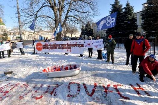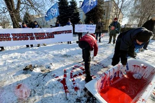 Opozanţii au scandat „bani însângeraţi” şi au desfăşurat o banderolă pe care scria „încetaţi să lucraţi cu Ianukovici”, după care au înmuiat bancnote false într-o cadă de baie plină cu vopsea roşie şi inscripţionată „Ucraina”. Ulterior, opozanţii prezenţi la manifestaţie au pus pe zăpadă bancnotele colorate în roşu astfel încât au format cuvântul „Ianukovici”.
