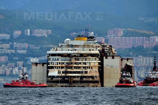 Epava navei, de două ori mai mare decât Titanicul, redresată şi ranfluată în ultimele luni, a pătruns duminică, înainte de prânz, în incinta terminalului Europe de Voltri, la periferia Genovei, tractată de mai multe remorchere, a constatat AFP.