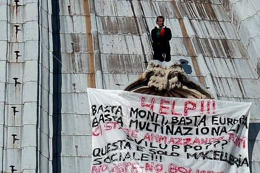 „Ajutor!!! M-am săturat de Monti, m-am săturat de Europa, m-am săturat de multinaţionale. Ne veţi ucide pe toţi. Dezvoltare??? Este vorba doar despre o exterminare socială”, proclamă bannerul.