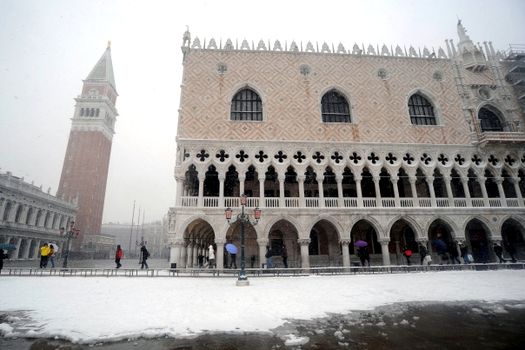 Oraşul italian Veneţia era inundat şi acoperit de zăpadă sâmbătă, în urma trecerii unei depresiuni, combinată cu un fenomen natural de maree, care a ridicat nivelul apelor lagunei cu 114 centimetri, potrivit Centrului veneţian de supraveghere şi previziuni ale mareelor.