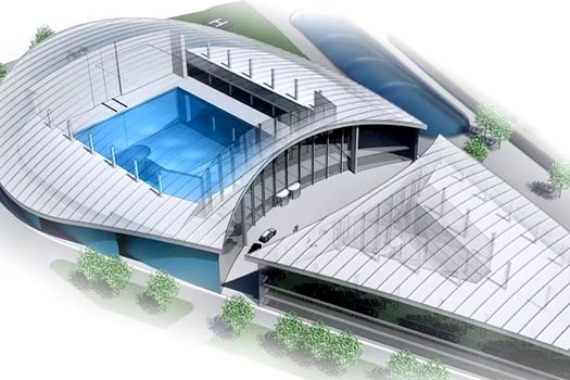 După cum se vede şi în imaginile publicate recent, piscina va fi construită în interiorul unei clădiri aparte, în formă de lacrimă, proiectată de arhitectul britanic Robin Partington.