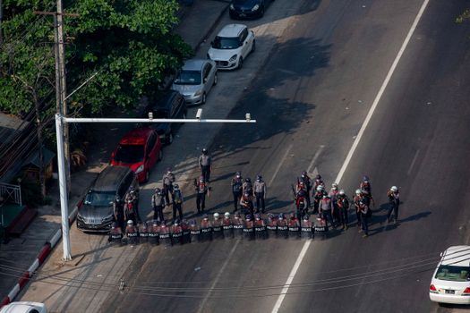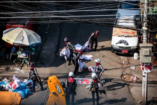 Regimul militar a anunţat instituirea legii marţiale în unele cartiere din oraşul Yangon (Rangoun), capitala economică a ţării, precum şi în zone din Mandalay, al doilea oraş ca mărime din Myanmar. Circulaţia a fost interzisă pe timp de noapte, iar adunările în grupuri mai mari de cinci persoane nu sunt permise.