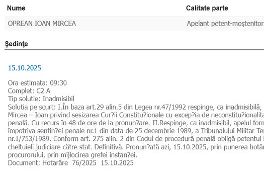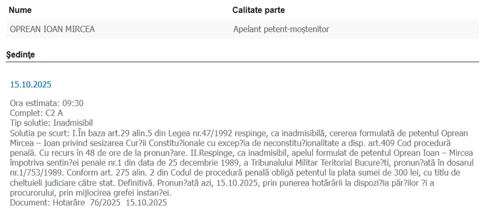 II. Respinge, ca inadmisibil, apelul formulat de petentul Oprean Ioan – Mircea împotriva sentinței penale nr.1 din data de 25 decembrie 1989, a Tribunalului Militar Teritorial București, pronunțată în dosarul nr.1/753/1989. Conform art. 275 alin. 2 din Codul de procedură penală obligă petentul la plata sumei de 300 lei, cu titlu de cheltuieli judiciare către stat. Definitivă”, se arată în decizia Curții Militare, prezentate în premieră de MEDIAFAX.