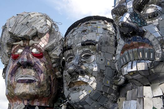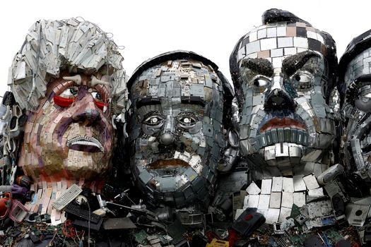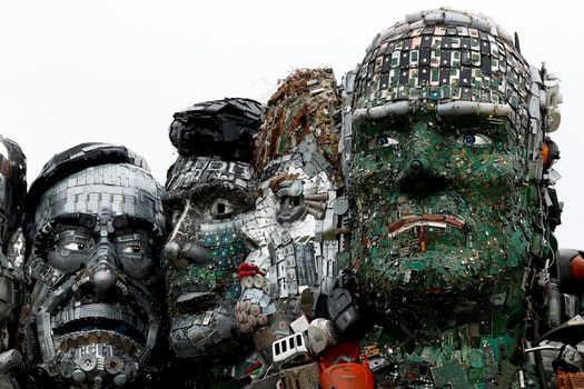 Sculptura realizată din deşeuri electronice, a fost ridicată în Marea Britanie şi îi prezintă, printre alţii, pe preşedintele american Joe Biden, premierul britanic Boris Johnson şi cancelarul german Angela Merkel.