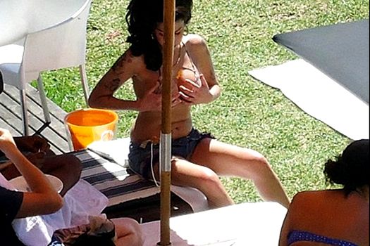 Amy a fost fotografiată la plajă alături de prieteni, în timp ce îşi atingea sânii care ieşeau din costumul de baie.