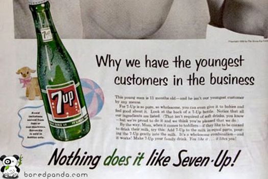 O altă reclamă, pentru o băutură carbogazoasă, arată un bebeluş bând dintr-o sticlă ţinută de ceea ce pare să fie mâna mamei lui, alături de mesajul „De ce avem cei mai tineri consumatori din industrie”.