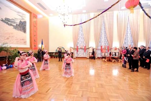La ceremonia de la Ambasada Chinei, cei prezenţi au asistat la un spectacol artistic, cu dansuri tradiţionale. Şeful statului le-a vobit celor prezenţi, potrivit fotografiilor.