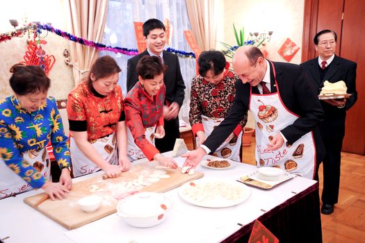 Preşedintele Traian Băsescu şi-a pus, marţi seară, la ambasada Chinei, un şorţ de bucătărie şi a participat, alături de ambasadorul acestei ţări la Bucureşti, la prepararea unor produse tradiţionale chinezeşti.
